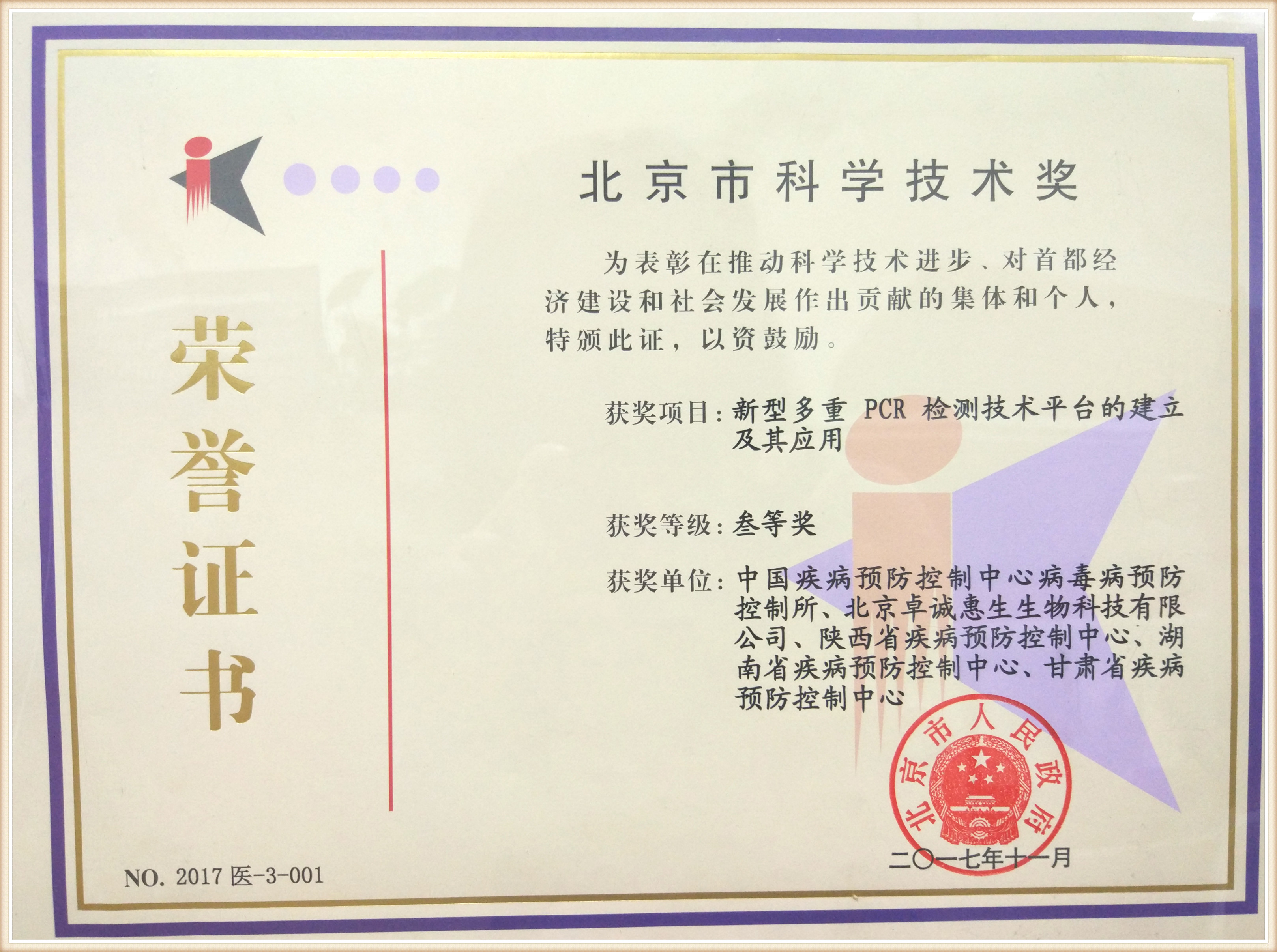 為表彰在2017年推動科學(xué)技術(shù)進(jìn)步,對首都經(jīng)濟(jì)建設(shè)和社會發(fā)展作出貢獻(xiàn)的集體和個人,北京市人民政府于2017年11月為北京卓誠惠生參與完成的“新型多重PCR檢測技術(shù)平臺的建立及其應(yīng)用”項目頒發(fā)北京市科學(xué)技術(shù)獎叁等獎,以資鼓勵。