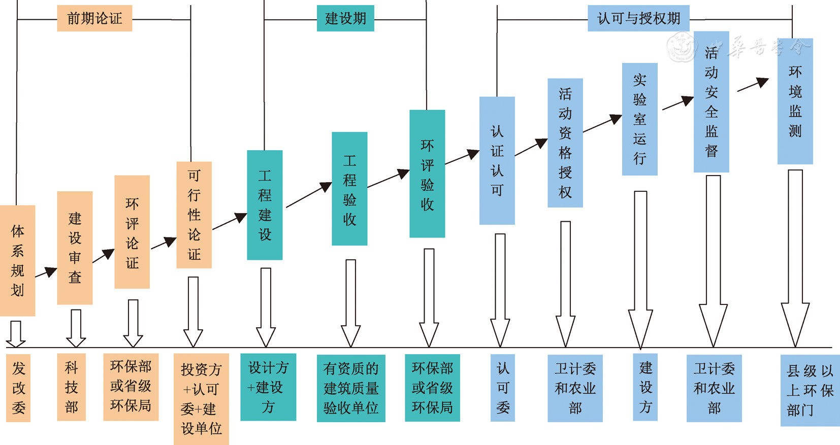 2003年中國(guó)暴發(fā)SARS疫情后,中國(guó)生物安全實(shí)驗(yàn)室建設(shè)得到極大發(fā)展,成為開展高致病性微生物研究、生物反恐、應(yīng)急處理生物危害事件的關(guān)鍵技術(shù)支撐平臺(tái)。但隨著病原微生物相關(guān)研究的快速增加,許多實(shí)驗(yàn)室的生物安全隱患開始凸顯,生物安全事故時(shí)有發(fā)生,特別是2004年中國(guó)發(fā)生實(shí)驗(yàn)室感染SARS病毒事件,并造成了人員和社會(huì)經(jīng)濟(jì)嚴(yán)重?fù)p失,引起中國(guó)政府對(duì)實(shí)驗(yàn)室生物安全的高度重視。為了加強(qiáng)實(shí)驗(yàn)室生物安全管理,保護(hù)工作人員和公眾的健康,國(guó)務(wù)院于2004年頒布了《病原微生物實(shí)驗(yàn)室生物安全管理?xiàng)l例》(國(guó)務(wù)院第424號(hào)令),這是中國(guó)第一部針對(duì)生物安全實(shí)驗(yàn)室生物安全的法律。條例規(guī)定了各部門在實(shí)驗(yàn)室建設(shè)管理中的職責(zé)。需要強(qiáng)調(diào)兩點(diǎn):一是在體系規(guī)劃環(huán)節(jié),2016年11月國(guó)家發(fā)展改革委(發(fā)改委)、科技部發(fā)布了《高級(jí)別生物安全實(shí)驗(yàn)室體系建設(shè)規(guī)劃(2016-2025年)》,新規(guī)劃明確了新增實(shí)驗(yàn)室建設(shè)不再局限于2004年發(fā)布的《國(guó)家高級(jí)別生物安全實(shí)驗(yàn)室體系建設(shè)規(guī)劃》中列出的實(shí)驗(yàn)室名錄;二是在活動(dòng)資格授權(quán)和活動(dòng)安全監(jiān)督環(huán)節(jié),2017年9月國(guó)務(wù)院發(fā)布《國(guó)務(wù)院關(guān)于取消一批行政許可事項(xiàng)的決定》,衛(wèi)生計(jì)生委和農(nóng)業(yè)部由"行政審批"改為"備案管理"。詳見圖1。