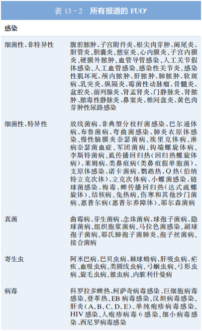總結(jié)過去20年來進(jìn)行的幾項(xiàng)FUO大型研究的結(jié)果。一般來說,感染占西方國(guó)家FUO的20%~25%。在西方國(guó)家以外的地區(qū),感染是FUO更常見原因(西方國(guó)家以外地區(qū)43%,西方國(guó)家22%),而由NIID和腫瘤引起的比例相似。西方國(guó)家以外地區(qū)的感染引起FUO患者中高達(dá)50%是由結(jié)核病引起的,結(jié)核病在美國(guó)和西歐并不常見。