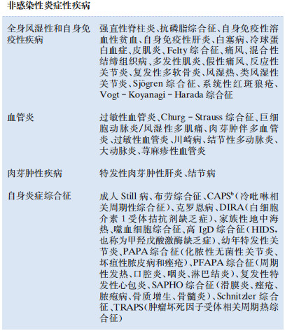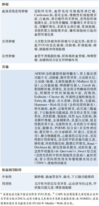 NIID患者中,大血管炎、風(fēng)濕性多肌痛、結(jié)節(jié)病、家族性地中海熱和成人Still病是FUO相當(dāng)常見的診斷。遺傳性自身炎癥綜合征非常罕見,通常年輕人多見。雖然大多數(shù)腫瘤都出現(xiàn)發(fā)熱,但迄今為止最常見的FUO腫瘤相關(guān)診斷是惡性淋巴瘤,有時(shí)發(fā)熱比體檢觸及淋巴結(jié)腫大更早出現(xiàn)。其他FUO原因中除了藥物引起的發(fā)熱和運(yùn)動(dòng)引起的過熱外都不常見。